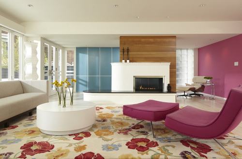 These continuous curved lines also feature inside the house, wrapping around the fireplace in this beautiful sitting room.